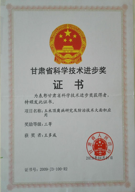 2010年榮獲甘肅省科學(xué)技術(shù)進(jìn)步三等獎證書